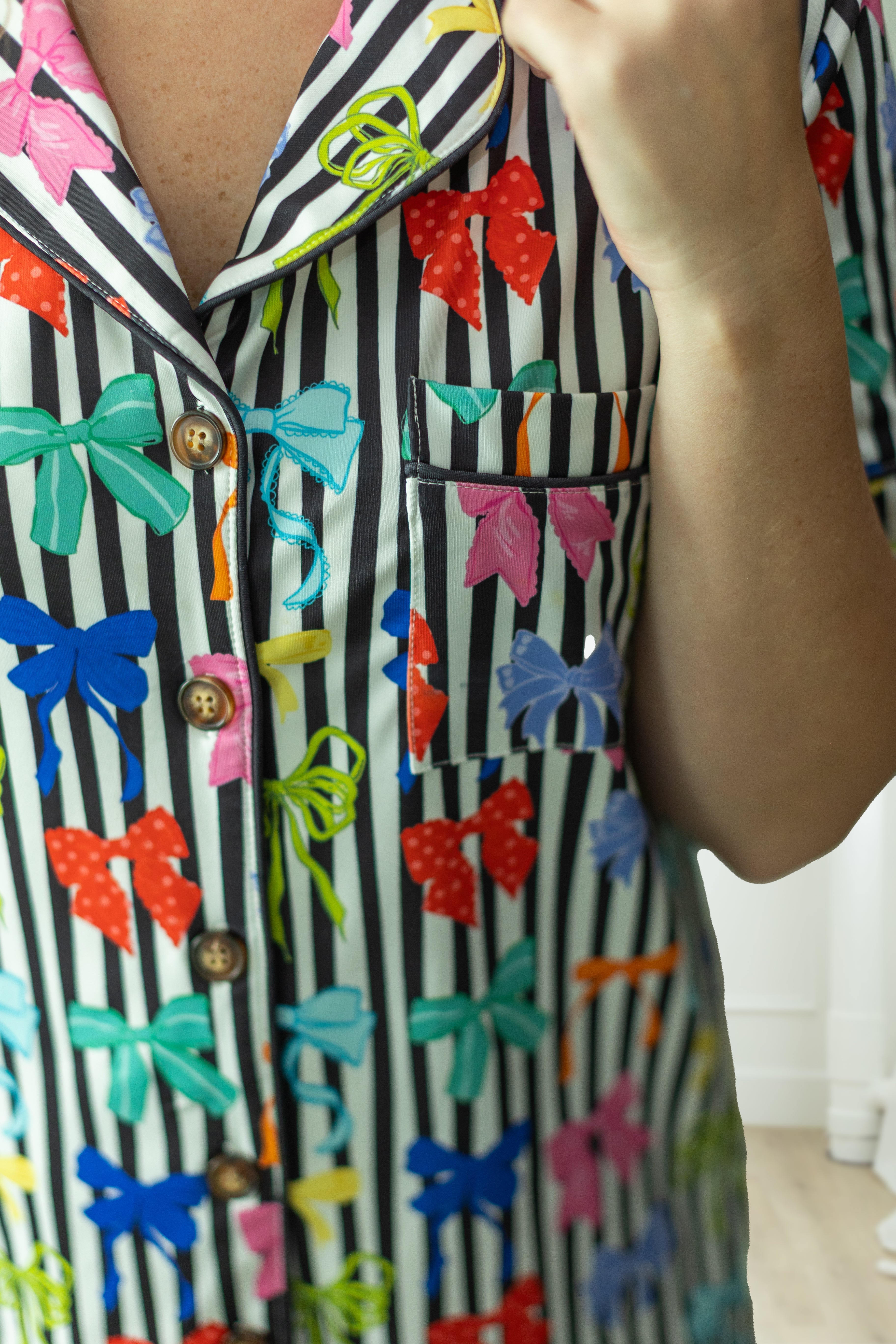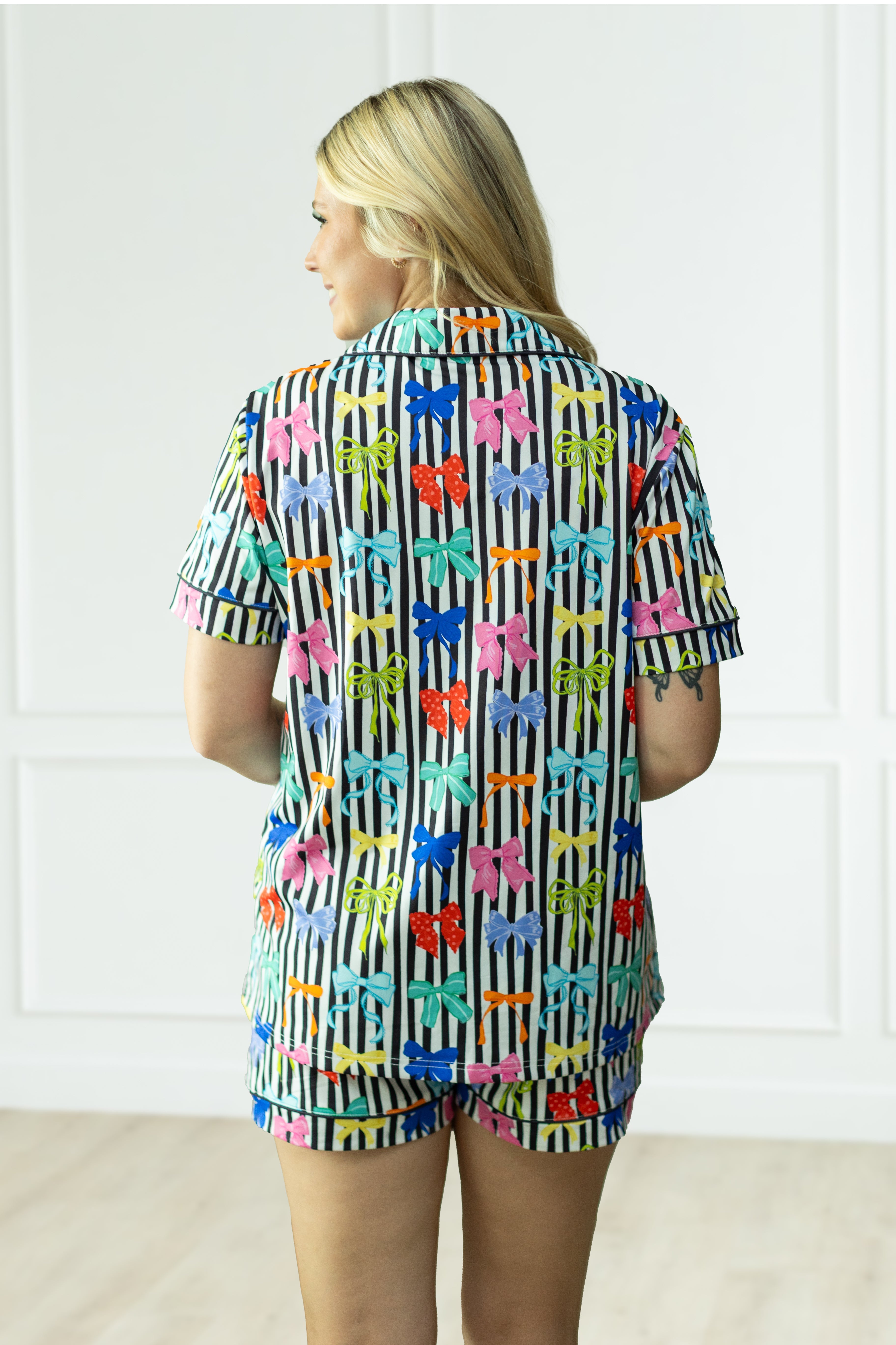 This set features a button-front shirt and a matching elastic-band short with pockets and button detail on the front.