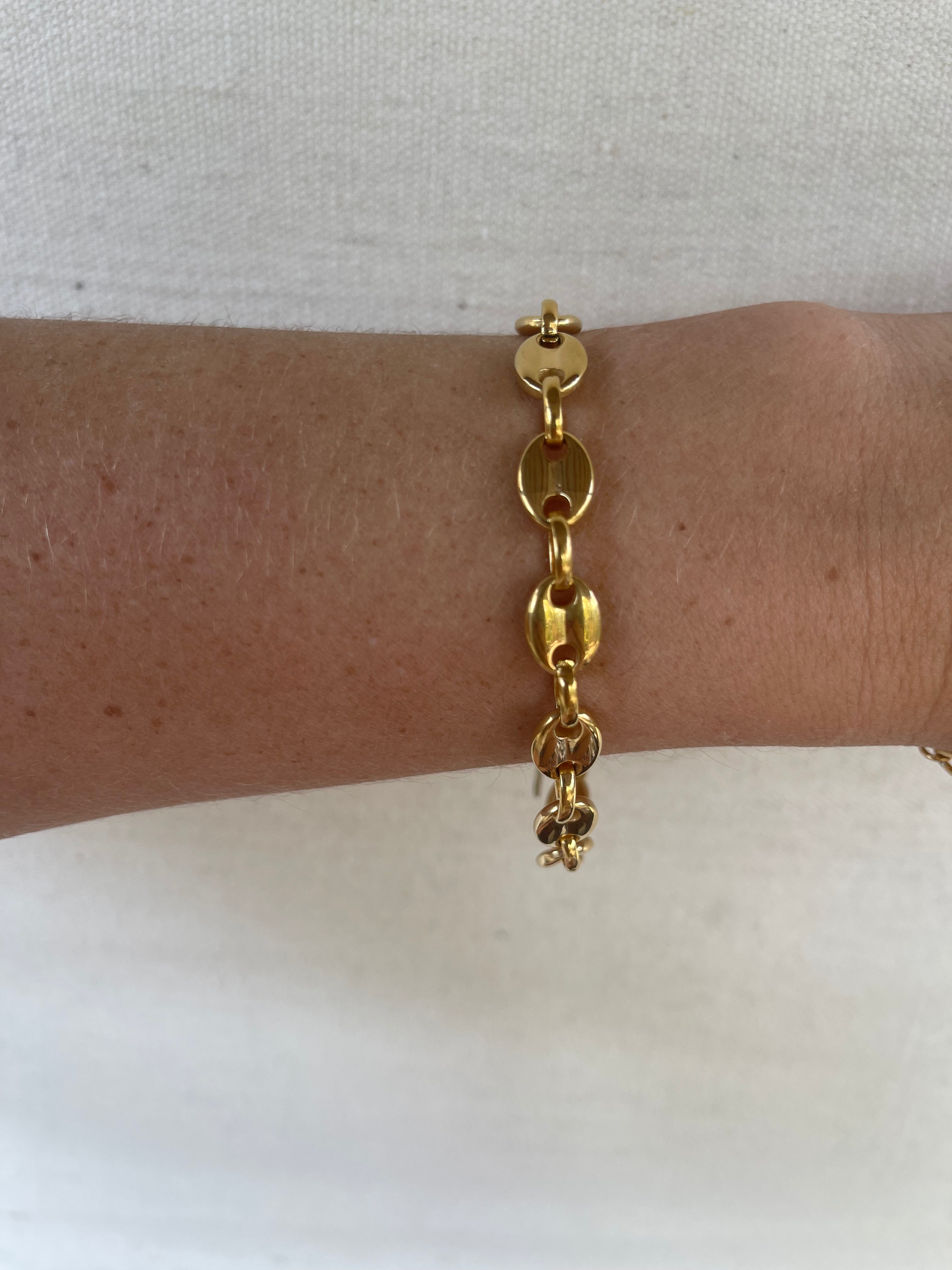 Indulge in elegance with the Coffee Bean 18k Gold Plate Bracelet, a luxurious piece inspired by the rich and timeless appeal of coffee beans. This bracelet features intricately designed beads plated in 18k gold, capturing the organic texture and shape of coffee beans. The warm gold plating adds a touch of luxury and sophistication, making it a versatile accessory that complements any outfit. Whether worn alone as a statement piece or paired with other bracelets for a layered look, the Coffee Bean 18k Gold Plate Bracelet is sure to add a touch of glamour to your ensemble. Perfect for coffee lovers or anyone with a penchant for unique and stylish jewelry, this bracelet is a chic addition to your collection.