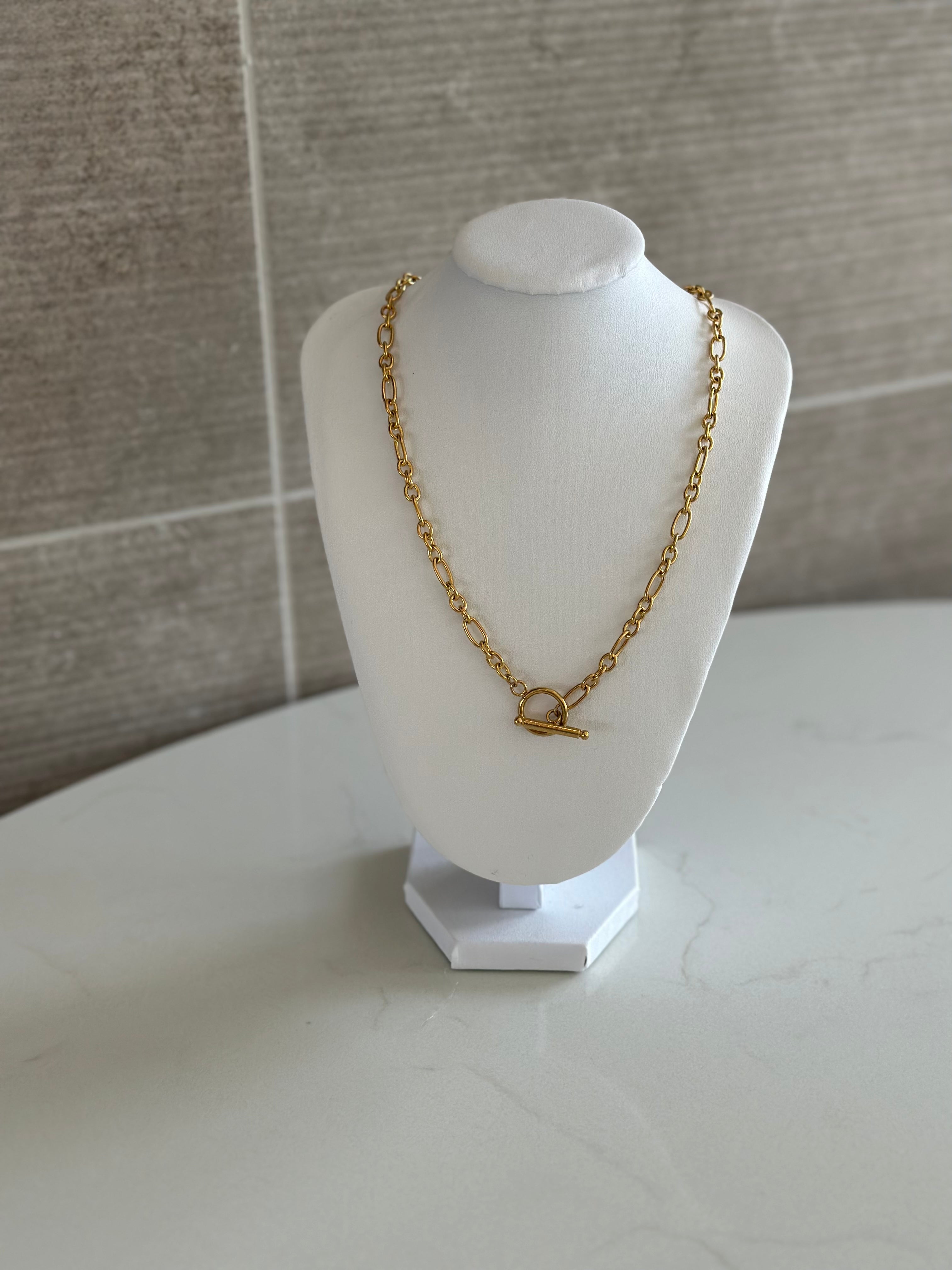 Introducing our Punky Toggle 18k Gold Plate Necklace, a bold and stylish accessory designed to make a statement. Crafted from stainless steel and plated with 18k gold, this necklace features a chunky oval link chain with a toggle closure, adding a touch of edgy sophistication to your ensemble.