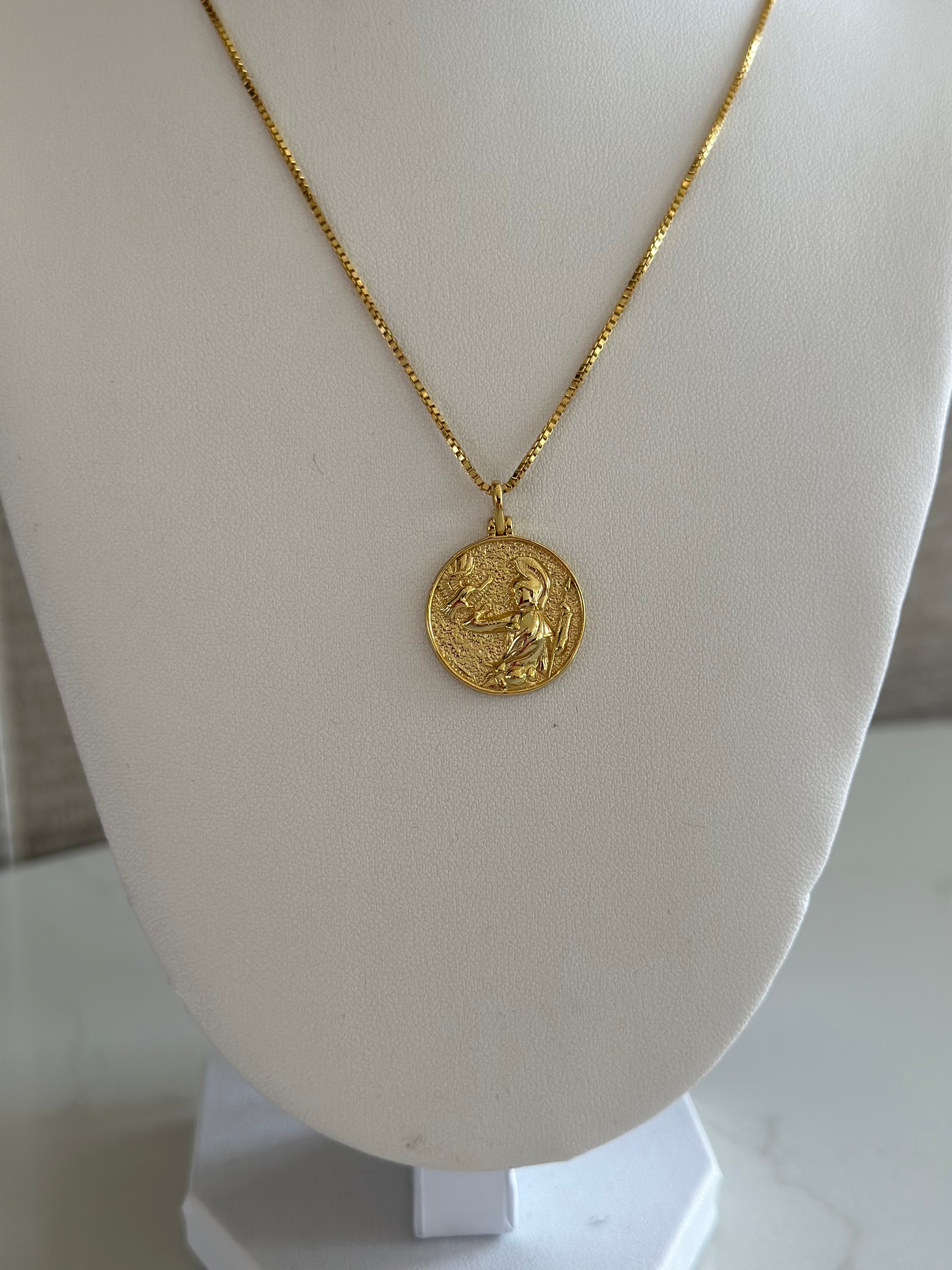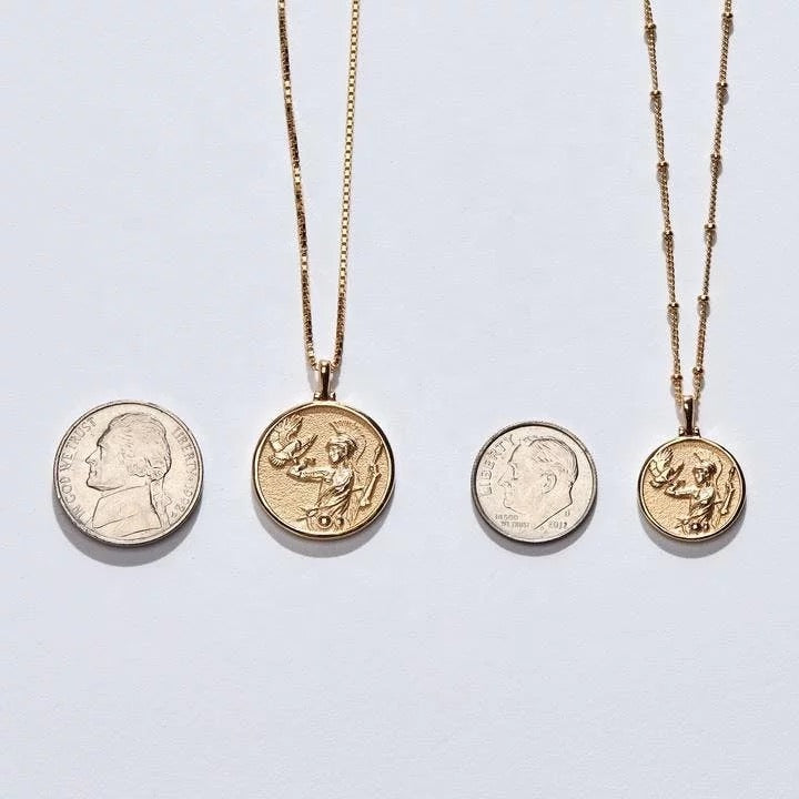 Embrace the timeless allure of ancient elegance with this Athena Coin Necklace, inspired by the legendary goddess of wisdom and warfare. The necklace features a meticulously crafted coin pendant depicting Athena's iconic image, symbolizing strength, wisdom, and grace. Suspended from a delicate chain, this necklace is a blend of classical beauty and contemporary style, making it a versatile and striking accessory for any outfit. Whether worn alone or layered with other pieces, the Athena Coin Necklace adds a touch of mythological charm and sophistication to your look.