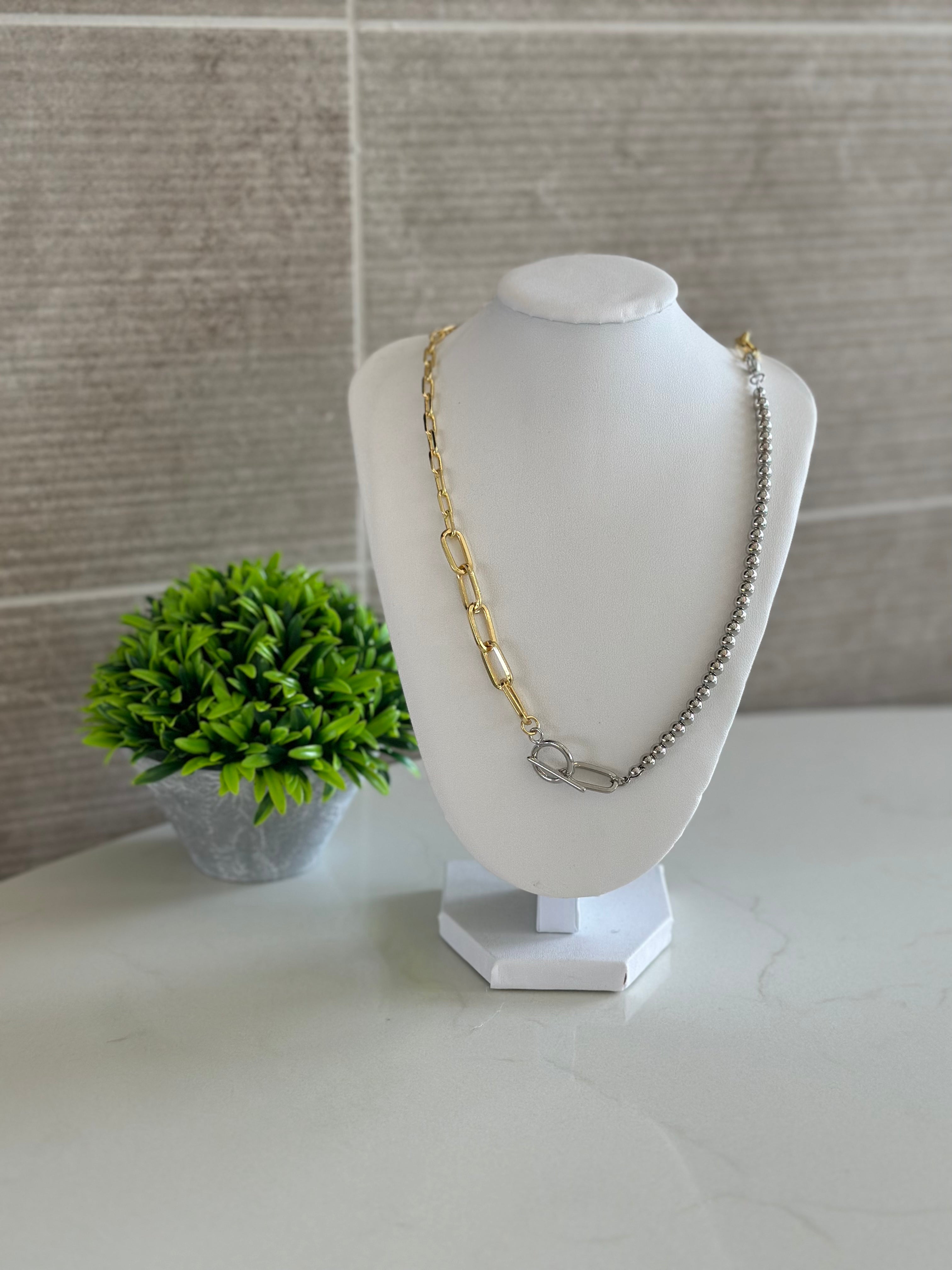 Introducing our Mixed Toggle Necklace, a chic and contemporary accessory that adds a touch of modern flair to any outfit. This necklace features a combination of mixed metal links, including gold and silver tones, creating a stylish and versatile look.